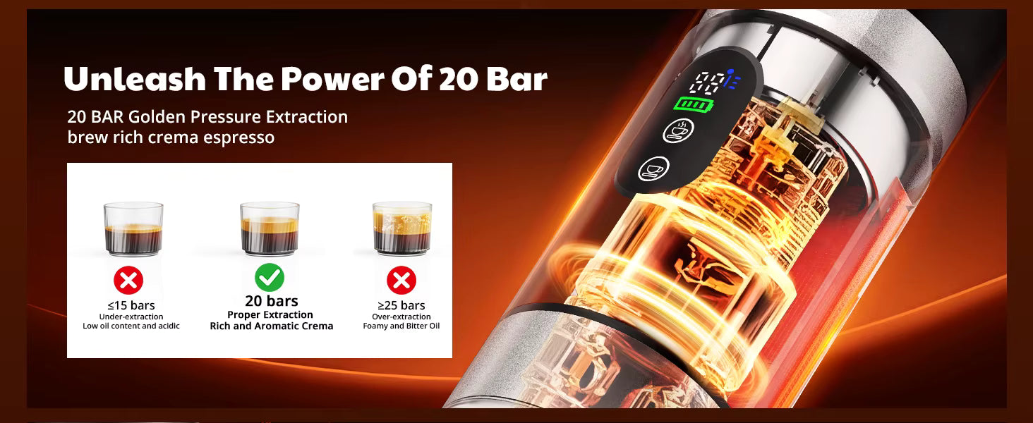 Unlike many portable gadgets that produce "weak" coffee, PureBarista™ utilizes a professional 20-bar extraction system. This high-pressure technology pulls a bold, full-bodied shot with a thick, golden crema, rivaling the quality of commercial café machines.
