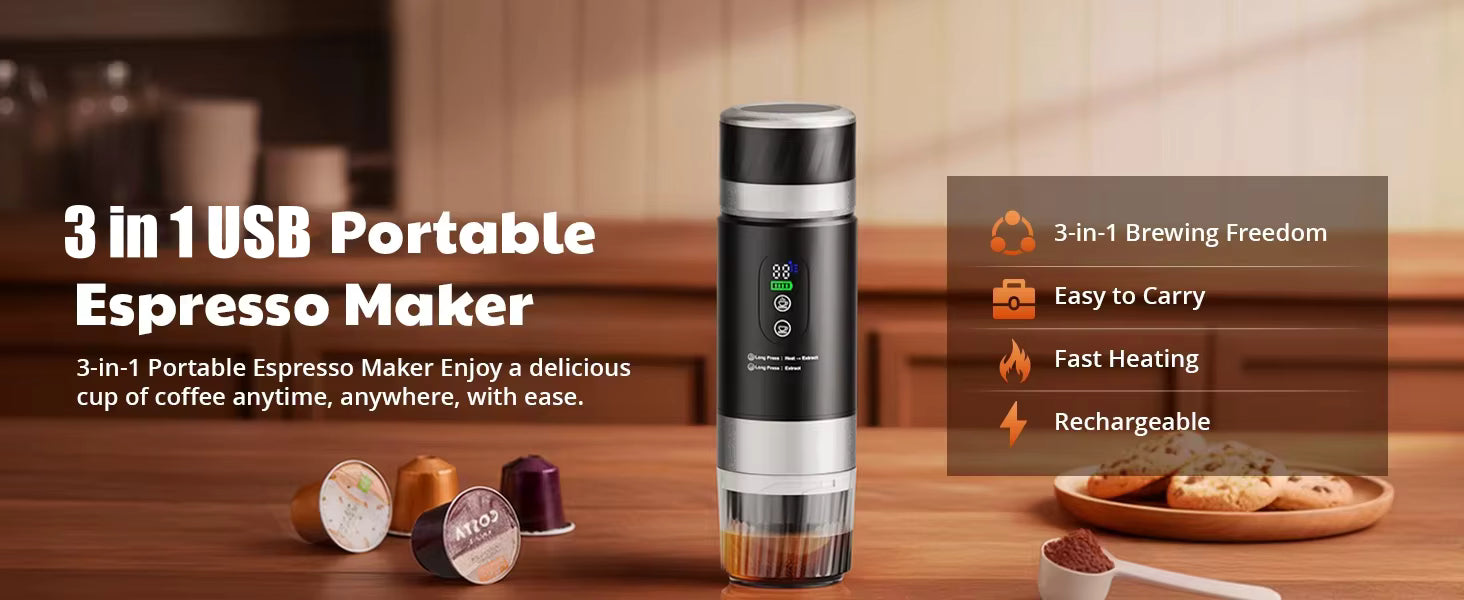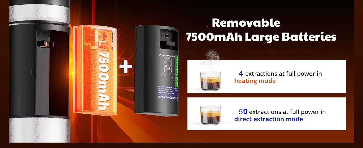 Our upgraded high-capacity battery is built for the long journey. You can enjoy up to 50 extractions per charge (when using pre-heated water). The device charges via a universal USB-C port, making it compatible with power banks, car chargers, and laptops.