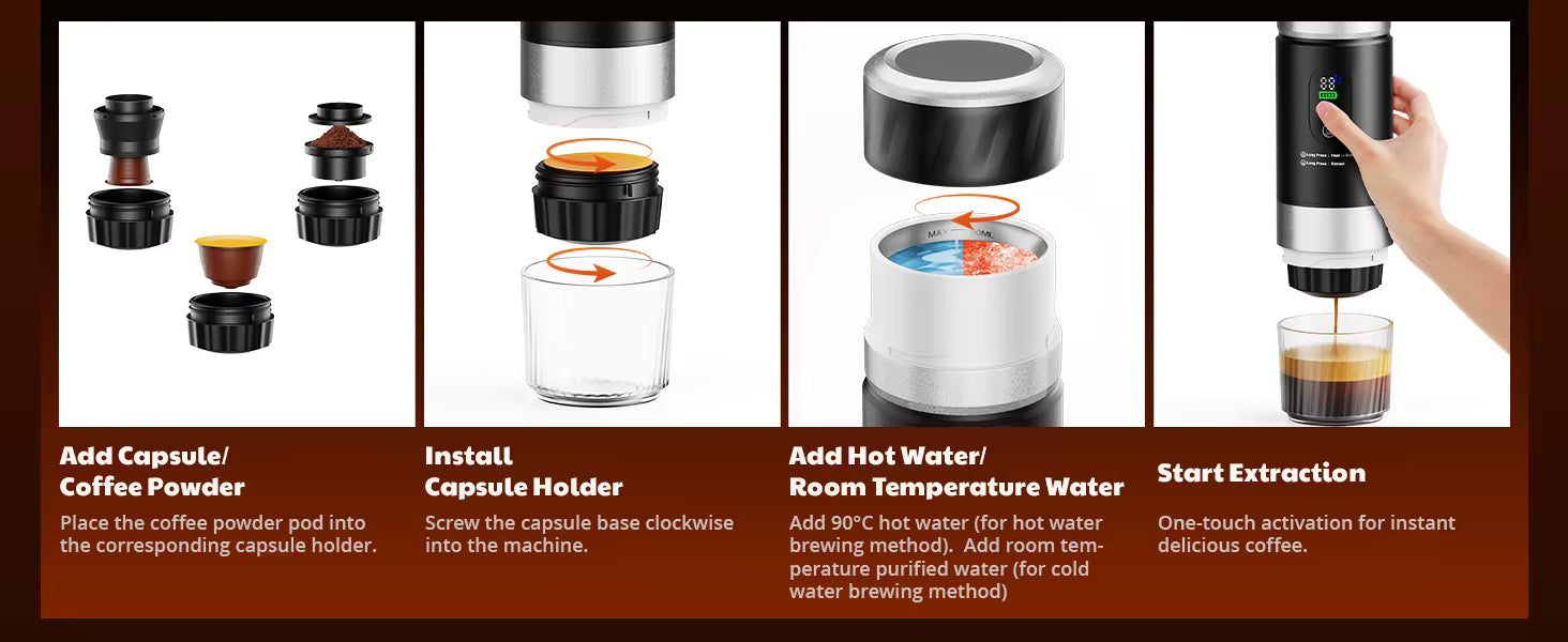 Our machine features a built-in heating system. You can simply add cold water, and the PureBarista™ will heat and brew it automatically in just 3–5 minutes. For even faster results or to save battery, you can also add pre-heated water for an instant extraction.